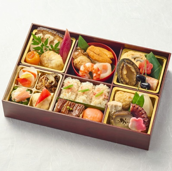 【口取り】だし巻き・鳴門穴子・わらびイカ・結び蒲鉾・ぶどう豆・鶴大根・パプリカ【小鉢】季節のお浸し【焼物】鯛黄身焼き・サーモン柚庵焼き・蒸し合鴨アスパラ巻き【煮物】あわび煮・たこ旨煮・海老旨煮・射込み高野豆腐・季節の煮物・南瓜・絹さや・花麩【強肴】長芋のサーモン巻き・牛肉山椒煮【酢の物】紅白なます・茗荷酢漬け・酢蓮根【揚げ物】裏白椎茸・みじんこ揚げ【ご飯】うなぎ寿司・俵白ご飯【甘味】笹巻甘味