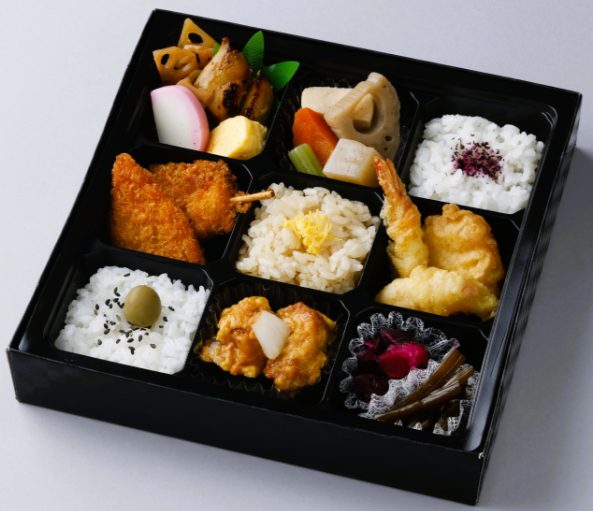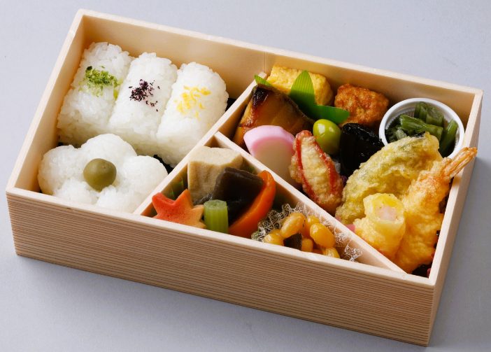 口取り、焼魚、煮物、天ぷら、牛そぼろ稲荷、鶏五目ご飯、香の物、天汁タレ