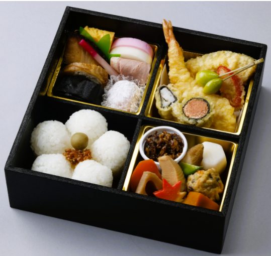 口取り、焼魚、煮物、天ぷら、鶏五目ご飯、牛そぼろご飯、香の物、天汁タレ