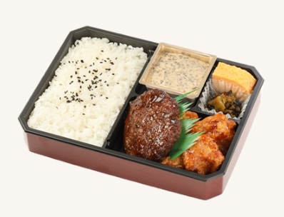 ハンバーグ、若鶏のチキン南蛮、塚だまトリュフタルタルソース、塚だま玉子焼き、高菜明太、ごはん(あきたこまち)