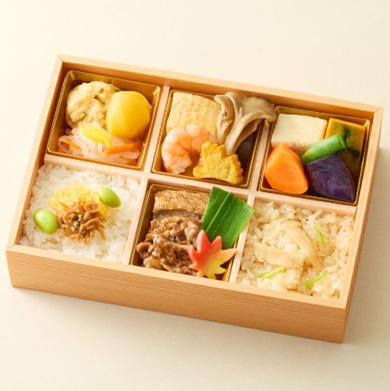 メインのお料理にお肉の旨味たっぷりの和牛のすき焼きが入り、栗甘露煮・菊花なますなどの季節の食材もちりばめられています。ご飯にはちりめん山椒を添えたご飯と旬の松茸ご飯をご用意。ボリュームたっぷりの秋のお弁当です。