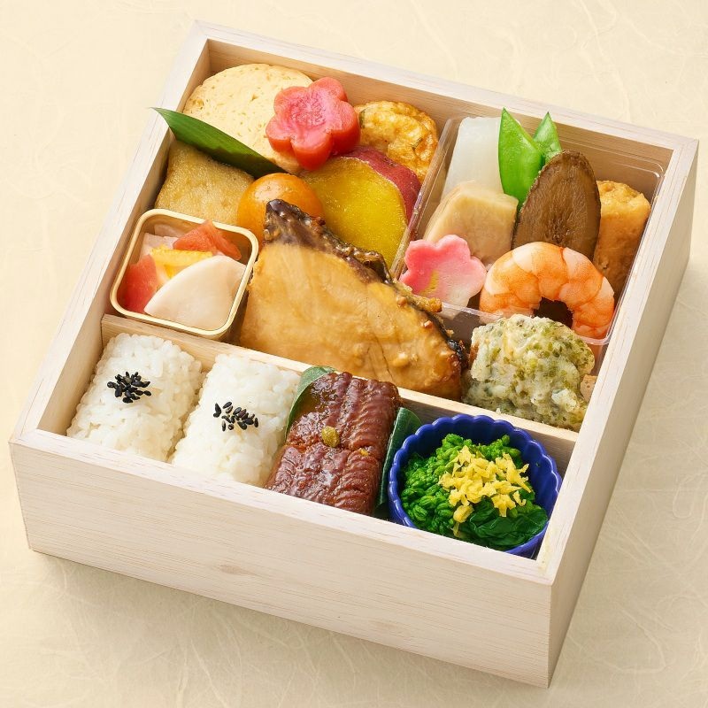 【口取り】小巻玉子・海老旨煮・九条葱入りさつま揚げ・粟麩揚げ煮・さつま芋甘煮・梅花人参・こんにゃく・厚揚げ・金柑【小鉢】菜の花のわさび和え(錦糸玉子)【焼物】ぶりの西京焼き【煮物】聖護院大根・小芋・ひろうす・牛蒡・絹さや・花麩【酢の物】聖護院かぶら酢(刻み柚子)【揚げ物】丹波若どりの磯辺揚げ【ご飯】うなぎ寿司・俵白ご飯